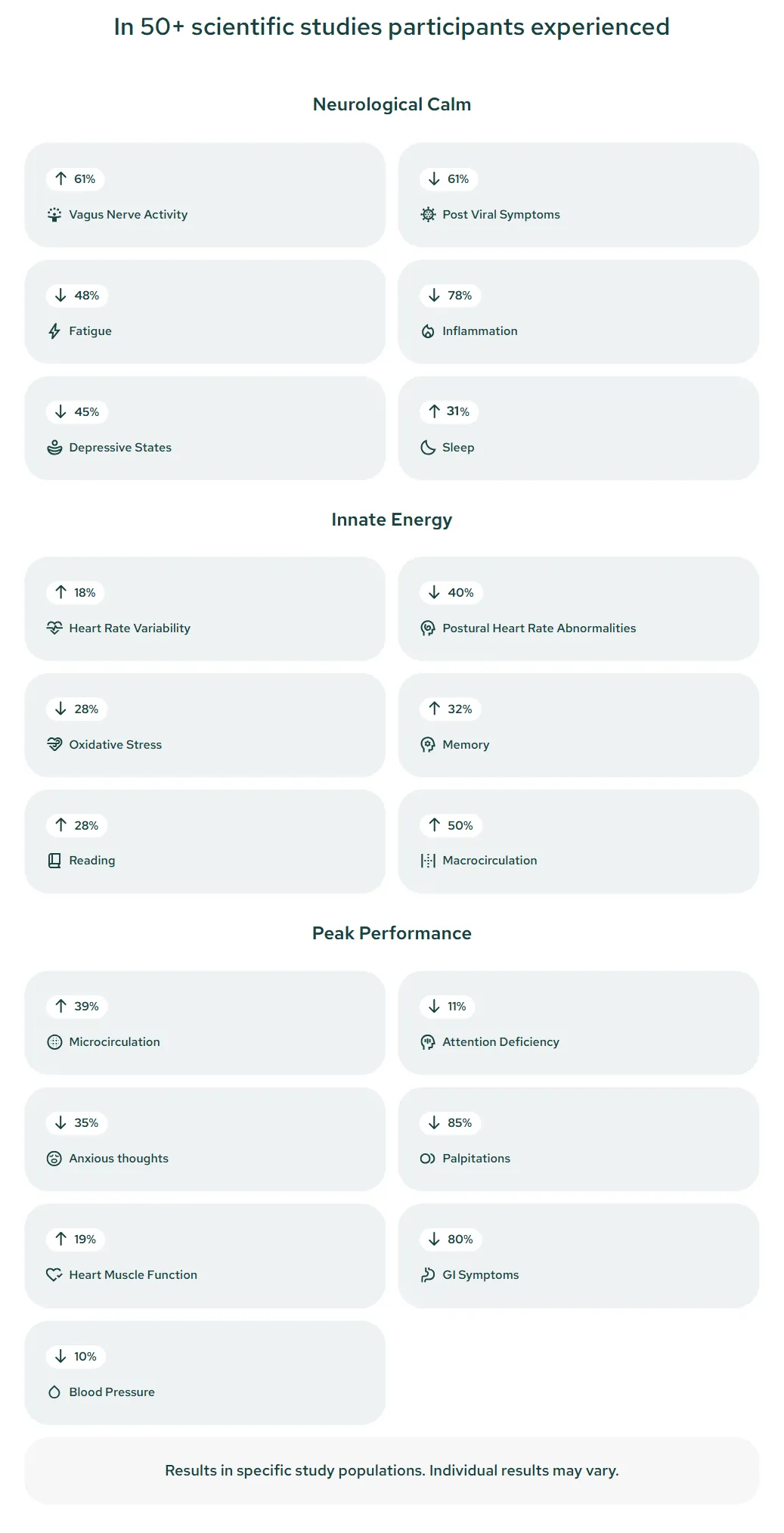 Scientific benefits 40+ peer-reviewed studies showing positive results in relieving symptoms of fatigue, gastrointestinal issues, mood, anxious thoughts, depressive states score, cognitive performance and heart rate variability
